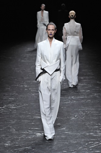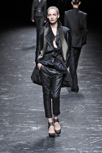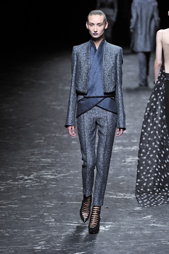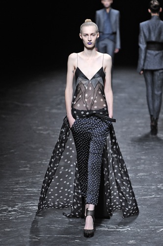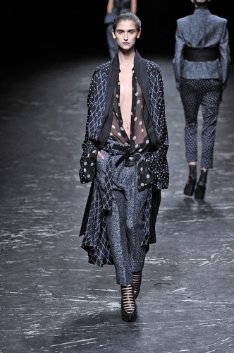 Os blazers, executados sempre com perfeição pelo estilista, trazem a dose certa de androginia, que se faz presente também nas impecáveis calças de cintura alta e até nos vestidos, graças às bandagens de couro incorporadas a tecidos levíssimos. Os polka dots salpicam a maioria dos looks, desenvolvidos numa cartela escura e sombria, basicamente em cinza e preto, trazendo um ar melancólico e fetichista ao verão de Ackermann.