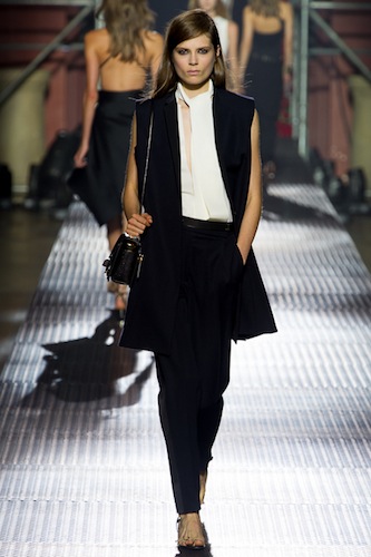 Apesar dos resquícios decorativistas vistos na metade do desfile, a coleção é repleta de looks limpos – em que o preto e branco, a alfaiataria absolutamente impecável e as linhas retas funcionam como fios condutores para as construções de Elbaz. As cores não ficam totalmente ausentes, porém restritas aos tubinhos nos momentos finais do show.