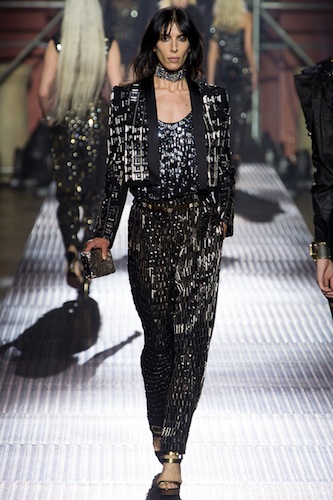 O fetichismo chique de Helmut Newton é visível tanto nos looks masculinos – com generosos decotes e aberturas -, quanto nos mais femininos, como os vestidos de organza que levam prints de corpos nus ou os mais abusados, de um ombro só. Os macacões com calças de modelagem ampla trazem um perfume oitentista à coleção, que marca um momento mais contido nas criações de Elbaz, mas, em nenhum momento, menos glamoroso.