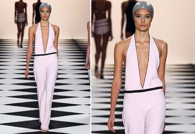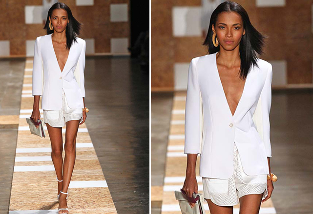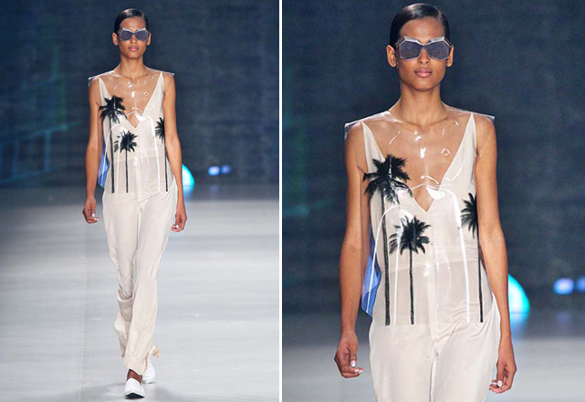 Na parte de cima, o decote da vez aparece em V profundo, como nos macacões retrô de Adriana Degreas, inspirados pela arquitetura carioca dos anos 1950. A Cori também aposta no decote, em look total white com blazer sem nada por baixo, ultra fresh. Helô Rocha também ousa no decotão no verão 2014 da Têca, mas equilibra a sensualidade com saias longas, mangas compridas e tecidos fluidos. O mesmo acontece na Osklen, que aplica o decote profundo em um macacão bege, sobreposto por top plastificado com estampa de coqueiro.