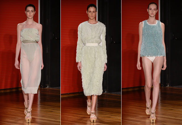 A aparente simplicidade cotidiana, que pautou as duas últimas coleções da Alexandre Herchcovitch, dá lugar a um incrível e rico trabalho manual, neste verão 2016. As formas seguem limpas, puras até, em parte pela inspiração discreta na cultural oriental. Mas sobre modelagens algo geométricas e silhuetas alongadas por saias transparentes, destacam-se incríveis minibabados de chiffon e látex, às vezes ainda com bordado micro cristais, lembrando o efeito da espuma das ondas do mar.