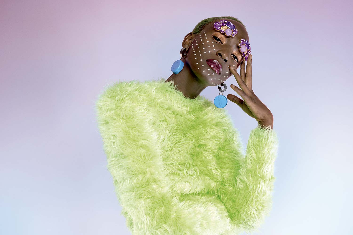 Lous Kakoma (IMM Bruxelles) usa casaco MSGM – Foto: Andrea Klarin, styling de Stephan Kallaus e beleza de Michael Salmen