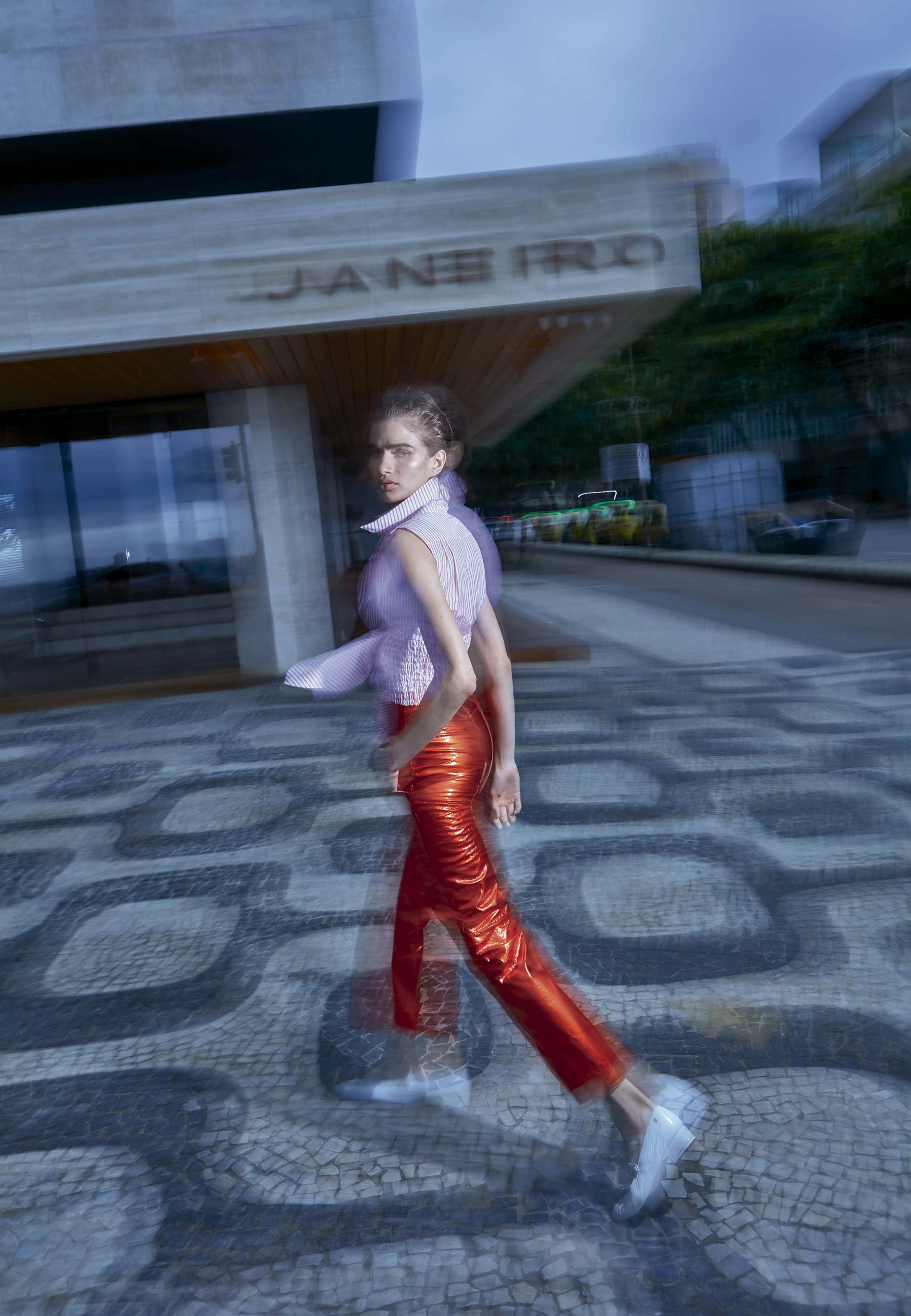 Linda Helena usa blusa de algodão, calça de couro e sapatos Chanel – Foto: Oskar Metsavaht, com edição de moda de Rodrigo Yaegashi, styling de Carlos Esser e beleza de Dindi Hojah