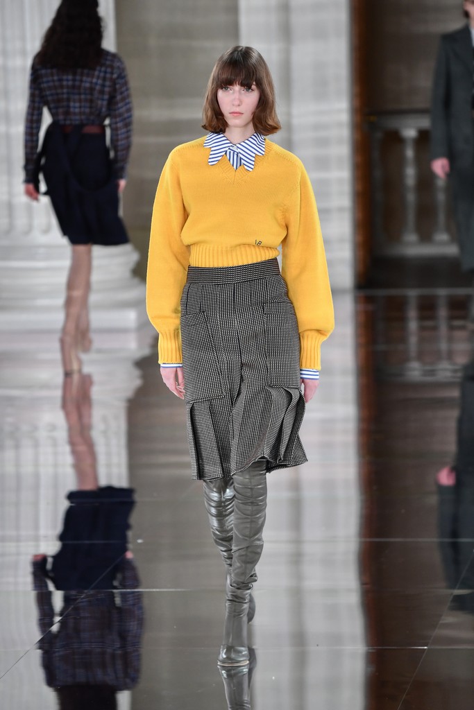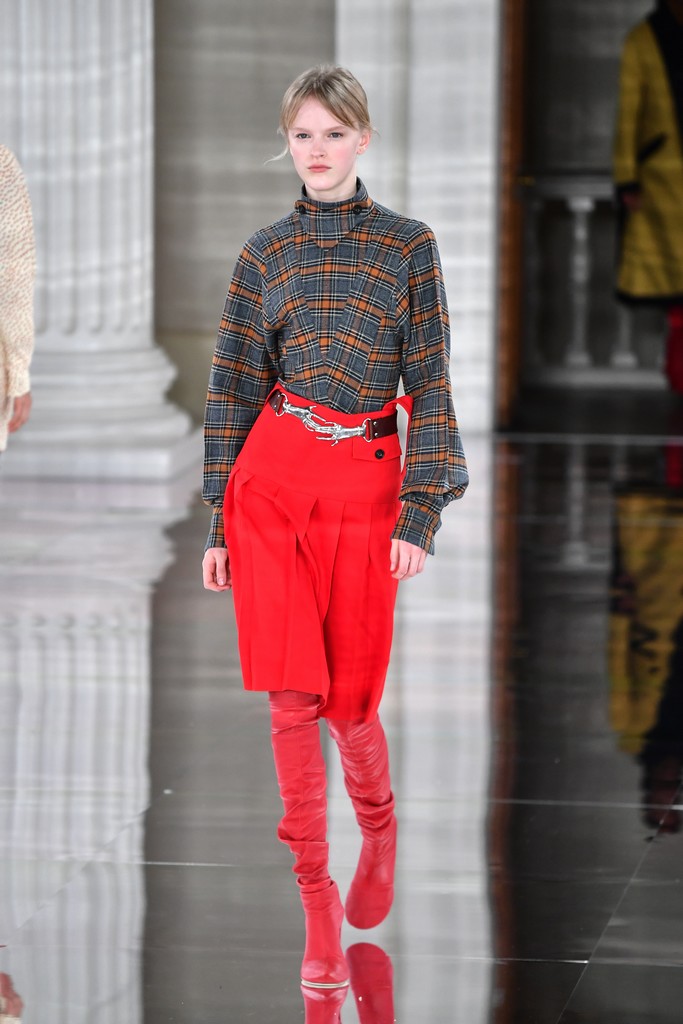 Recortes apareceram em diversas peças do inverno 2020, criando detalhes e substituindo padrões comuns. Na foto, por exemplo, a sobreposição do suéter de lã recortado com a camisa quadriculada cria uma nova estampa de losangos.