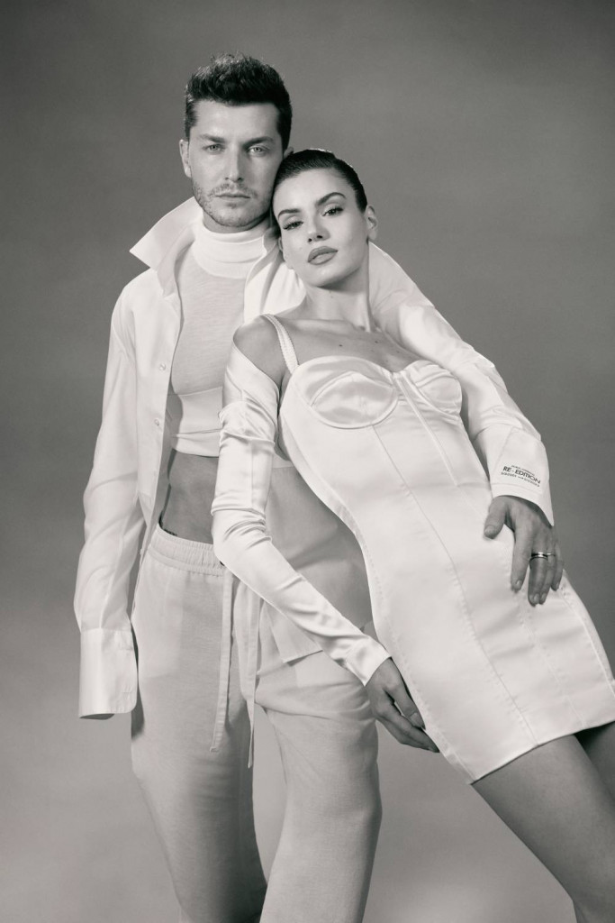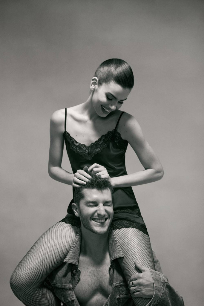 Camila Queiroz usa body Intimissimi, saia e gargantilha Moun Off e sapato Aquazzura, e Kleber veste cueca Intimissimi, calça Moun Off e bota Louboutin – Foto: Gui Paganini, com styling de Bruno Uchôa e beleza por Silvio Giorgio