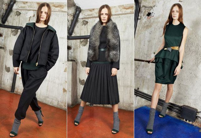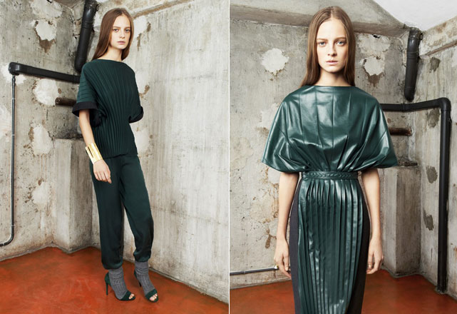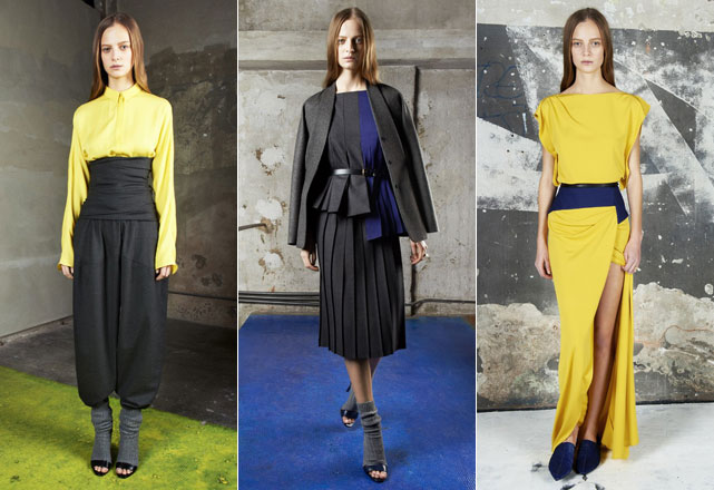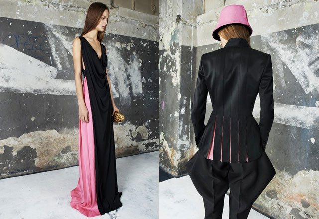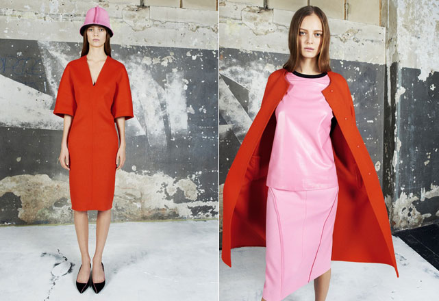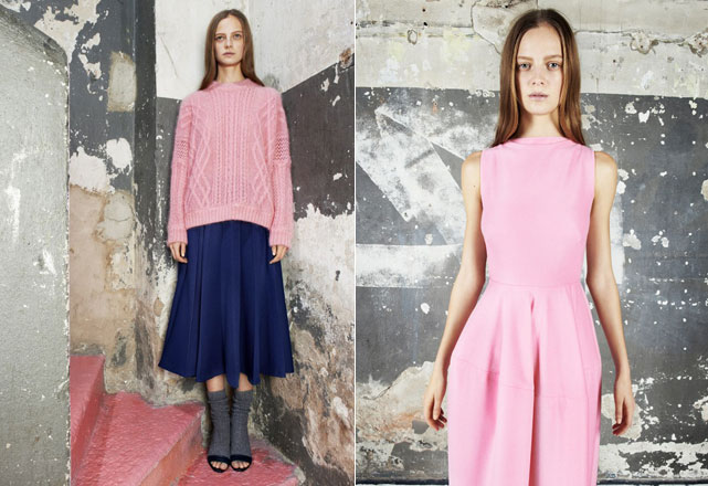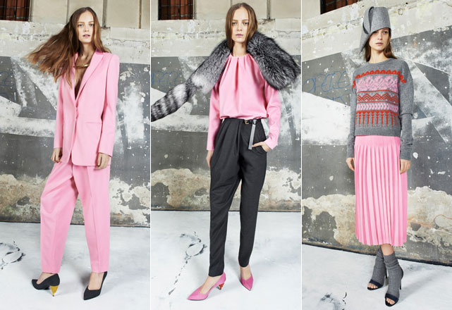 Três looks do pre-fall 2014 da Vionnet pontuados pela cor rosa e os tradicionais pregueados da marca – Fotos: Reprodução