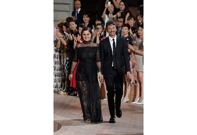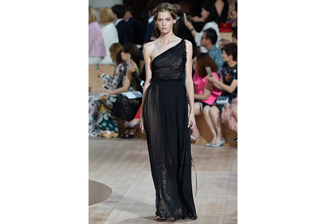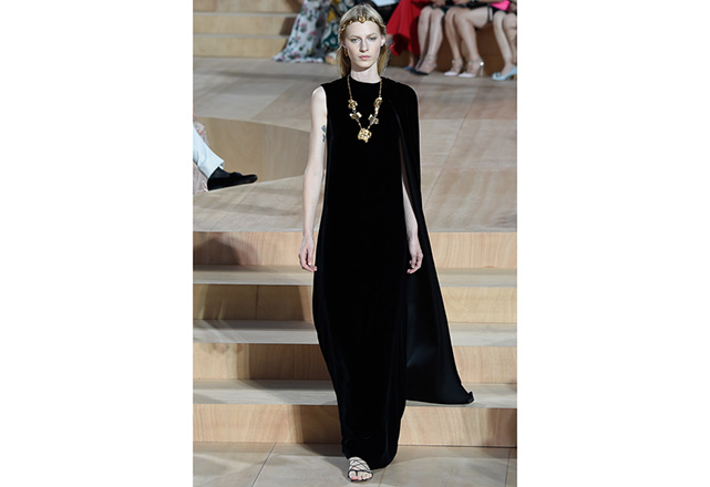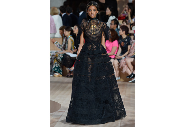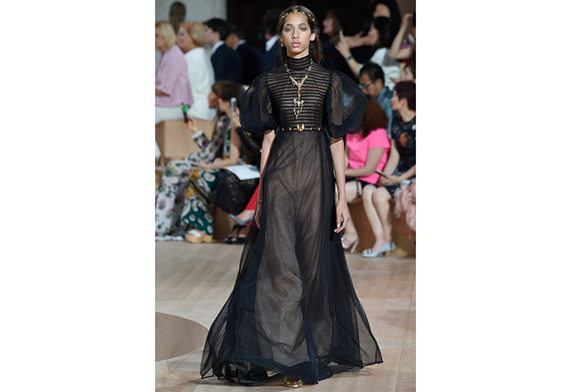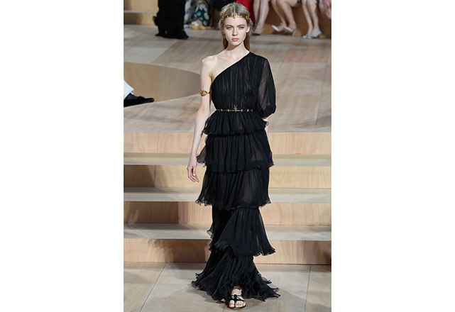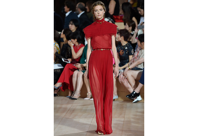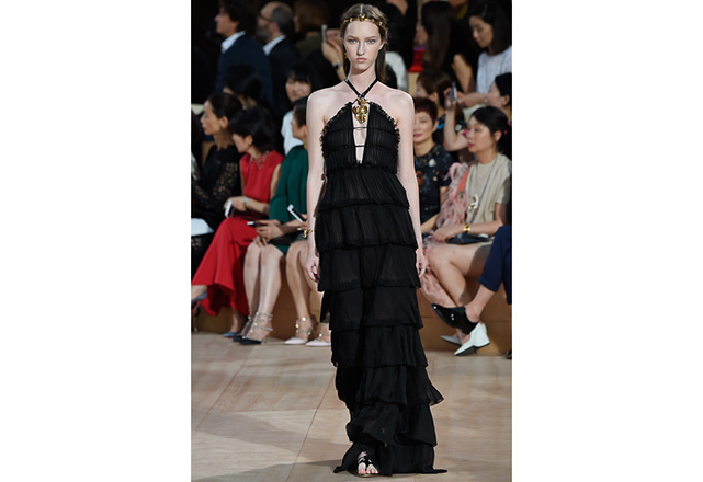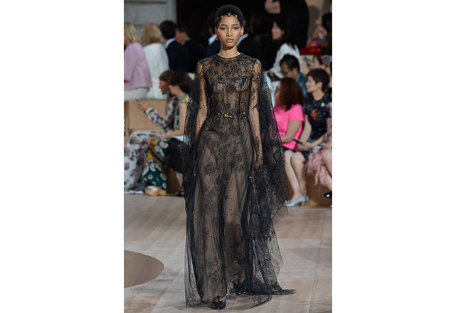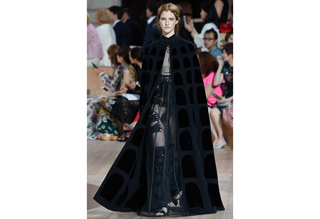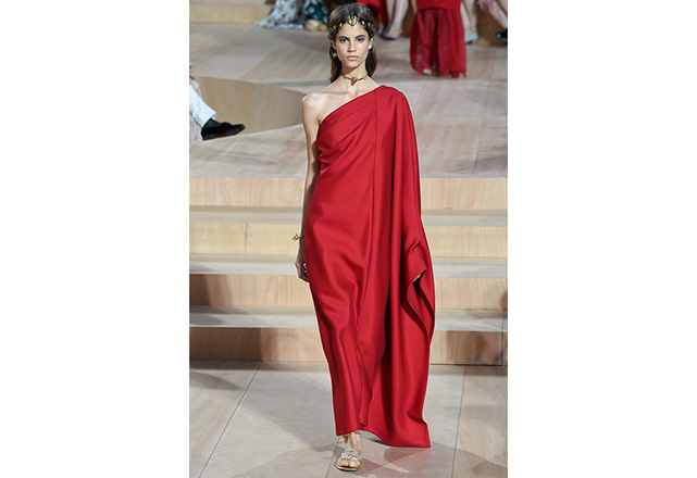 A praça em frente a nova flagship da Valentino em Roma (a maior de sua história) foi o cenário para o desfile de alta-costura da Maison. Maria Grazia Chiuri e Pierpaolo Piccioli, diretores criativos, apresentaram capas e vestidos em tecidos e formas fluidas, com sandálias rasteiras nos pés, emulando os trajes do império romano. O preto e variações de vermelho foram as cores predominantes, tudo arrematado com acessórios e adornos dourados.