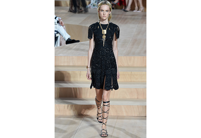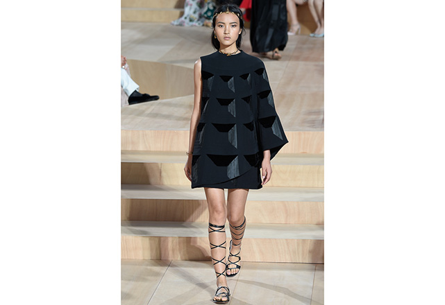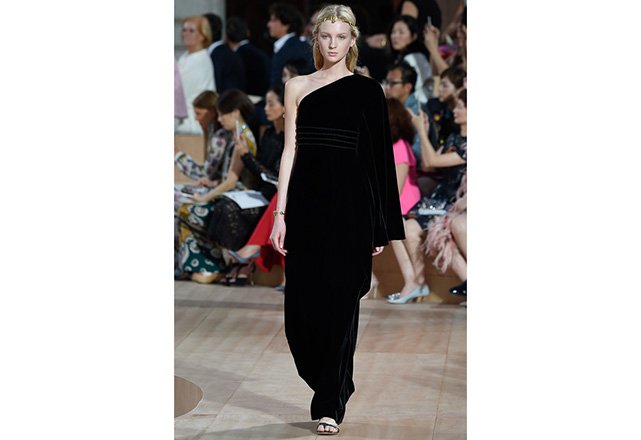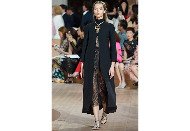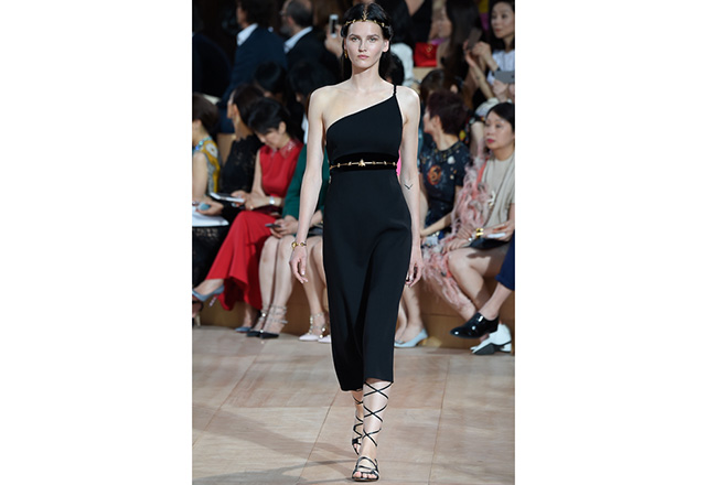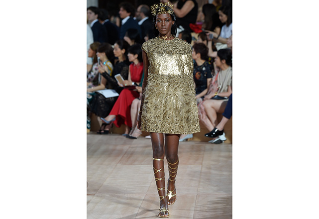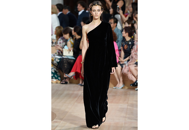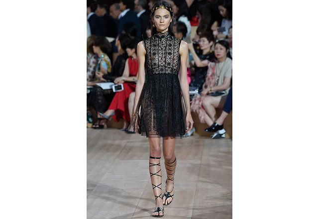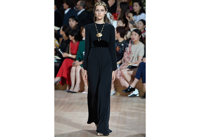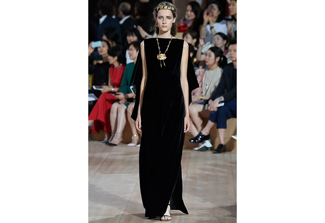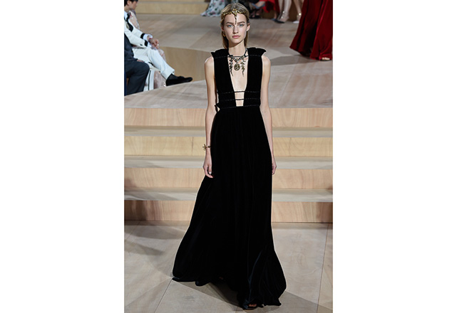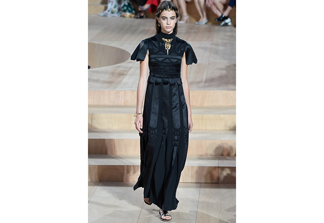 A praça em frente a nova flagship da Valentino em Roma (a maior de sua história) foi o cenário para o desfile de alta-costura da Maison. Maria Grazia Chiuri e Pierpaolo Piccioli, diretores criativos, apresentaram capas e vestidos em tecidos e formas fluidas, com sandálias rasteiras nos pés, emulando os trajes do império romano. O preto e variações de vermelho foram as cores predominantes, tudo arrematado com acessórios e adornos dourados.
