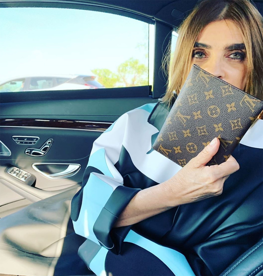 E não é toda working girl que precisa de uma maxibolsa: Carine Roitfeld, diretora de moda da Harper’s Bazaar, leva só o essencial em sua Louis Vuitton – documentos e celular.