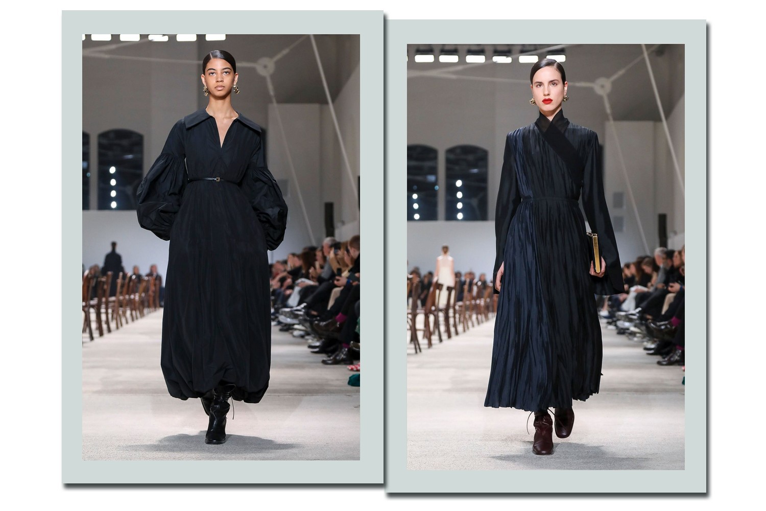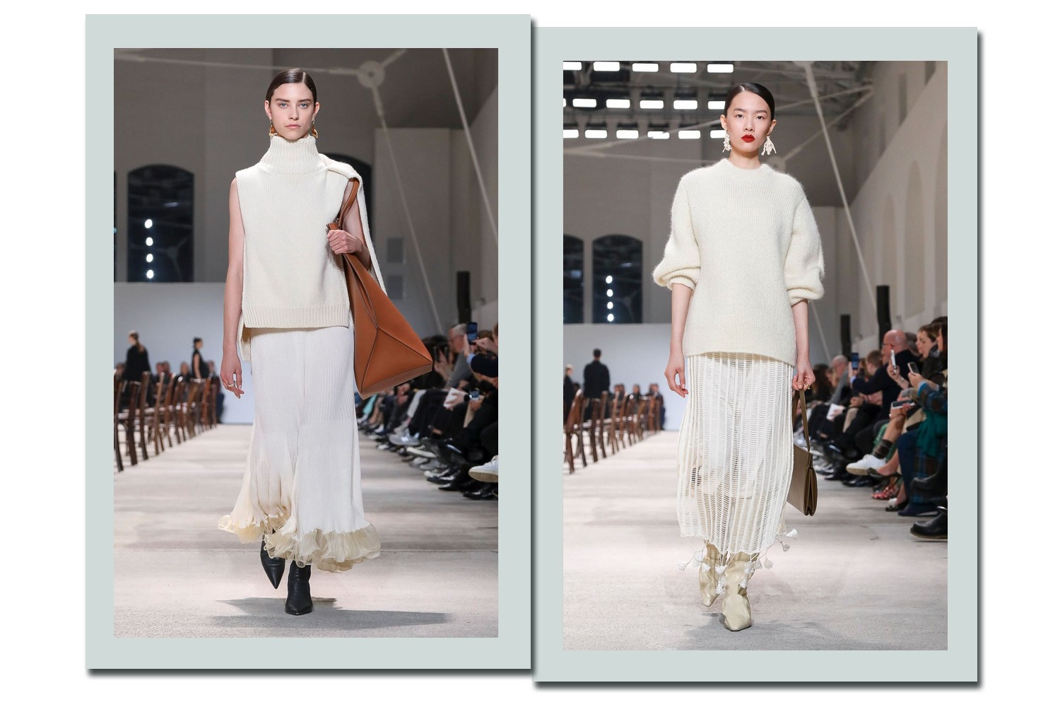 Vestidos são perfeitos para a correira do dia a dia, principalmente por serem peças únicas. Na coleção de inverno 2020 de Jil Sander, este tipo de modelo ganhou proporções maiores, com saias rodadas, mangas armadas e bastante tecido.