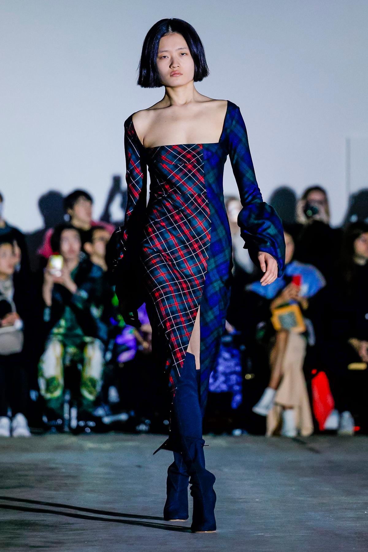 Na A.W.A.K.E., o xadrez veio bem coloridos, pontuado de vermelho e azu no vestido assimétrico.