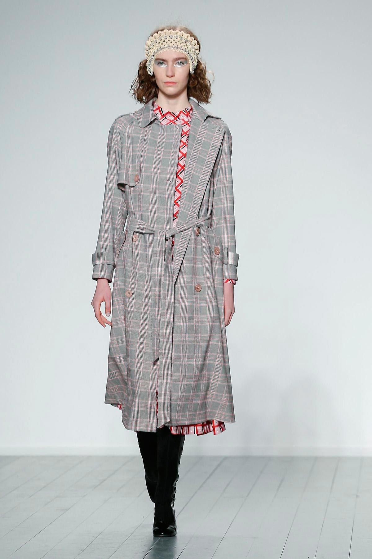 A Bora Aksu preferiu o clássico cinza para o sobretudo, mas deu bossa ao look com o vestido de estampa geometrica.