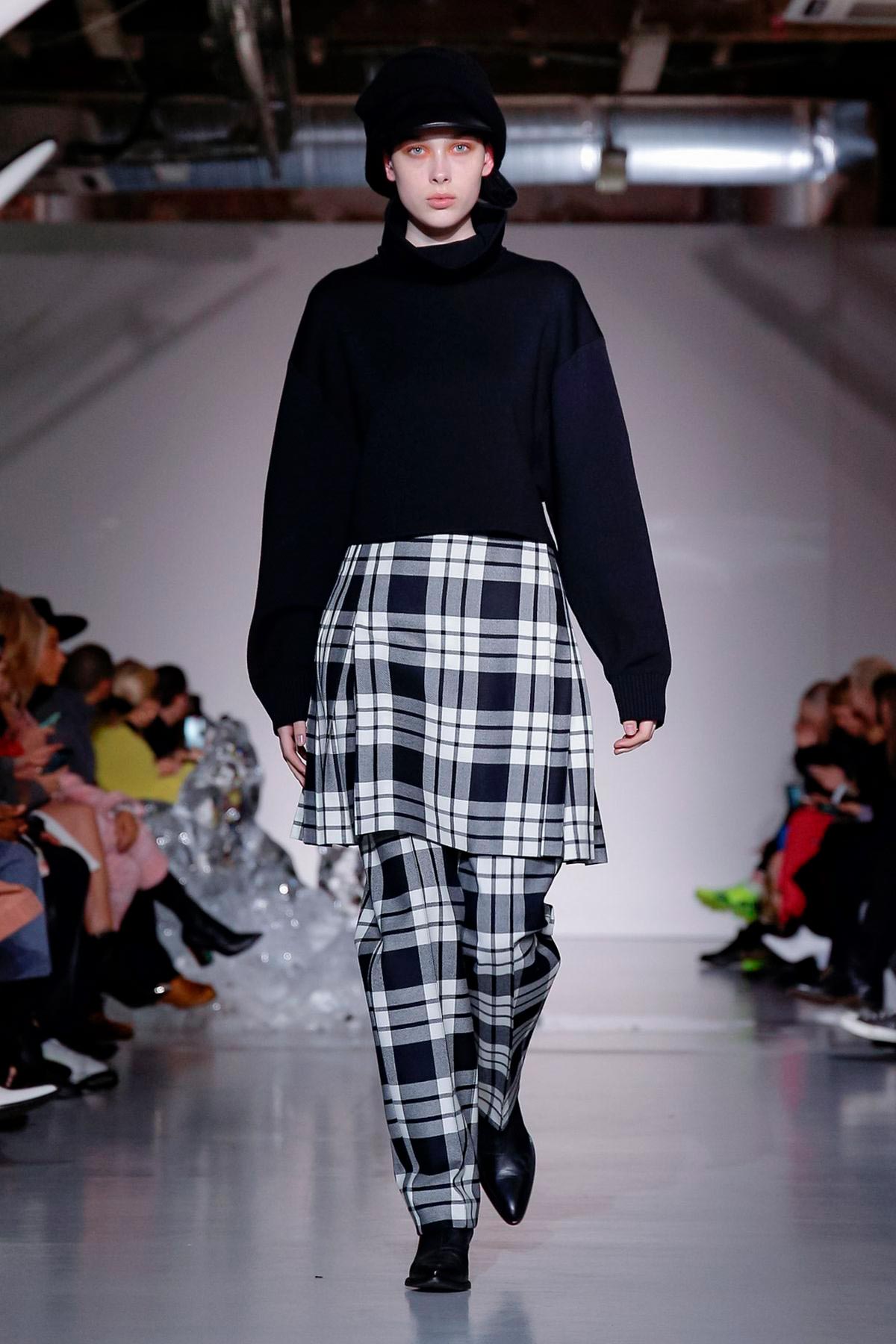 Eudon Choi usou o xadrez de forma elegante e fez uma calça que misturou a estampa com tecido liso.
