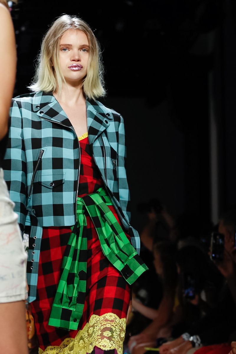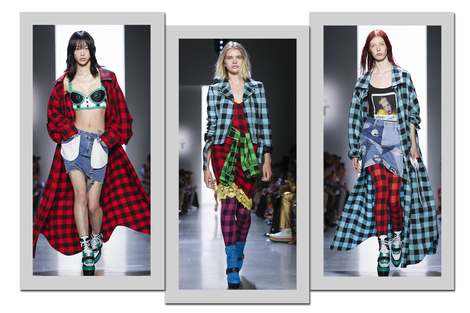 Jeremy Scott é pop, é rock, é tudo junto e misturado! Em sua nova coleção, ele reviveu o xadrez bem típico do grunge dos anos 1990, em cores fortes e pontuado pelo preto, em longas camisas de flanela usadas abertas por cima do look e também na clássica versão amarrada na cintura.
