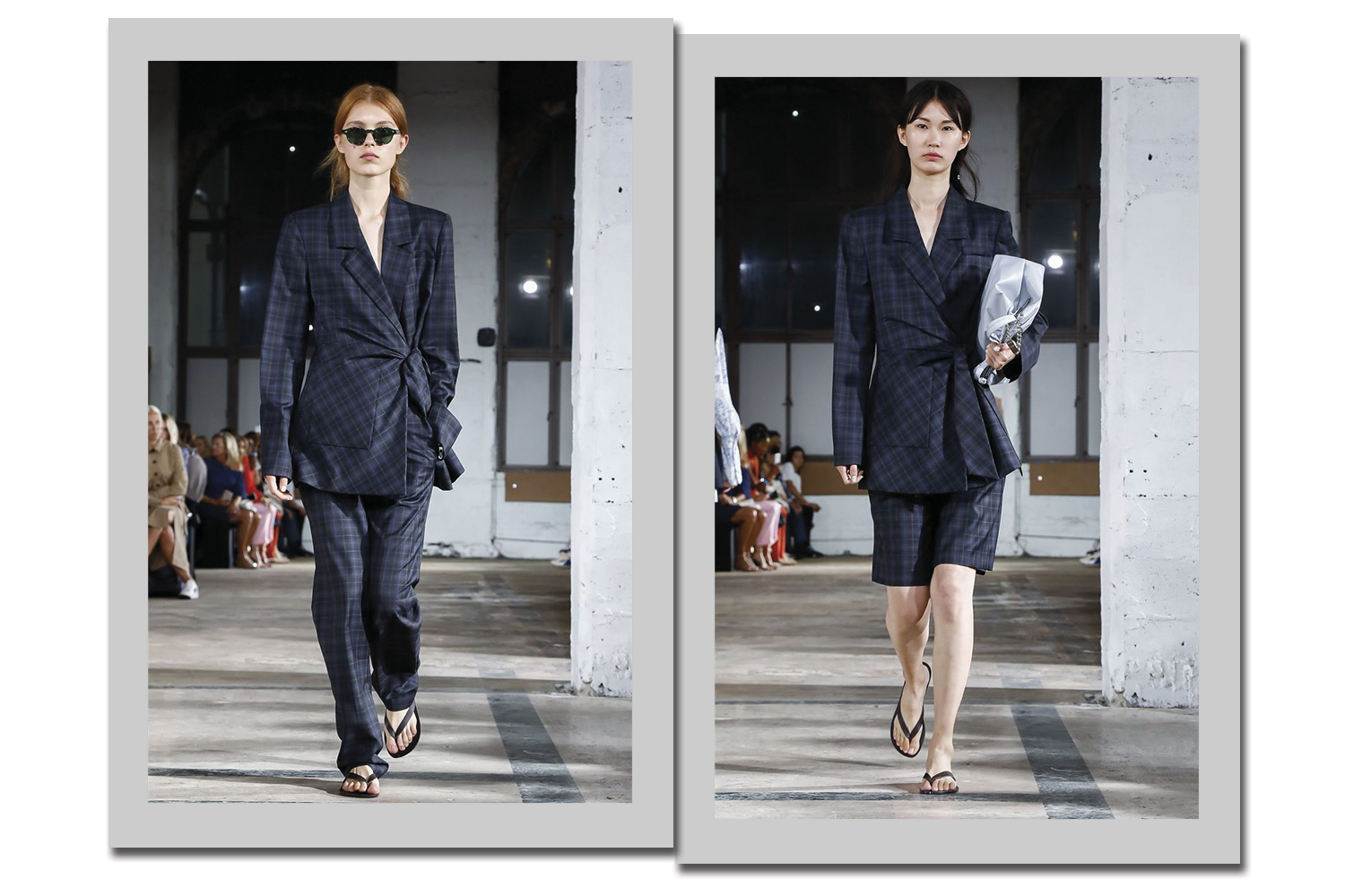 A Tibi, uma das labels norte-americanas que mais se destaca pela alfaiataria impecável, usou o xadrez azul em dois looks que vão fazer bonito no escritório: um com calça, outro com bermuda, ambos com blazer tipo quimono, de comprimento mídi e amarração lateral.