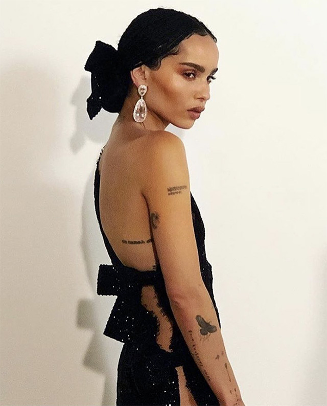 Para garantir finesse em eventos mais chiques, Zoë opta pela coque baixo, adicionando o laço preto para arrematar – Foto: Reprodução/Instagram/@zoeisabellakravitz